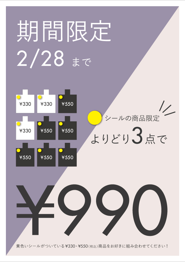 「よりどり3点990円キャンペーン」がスタートいたしました。